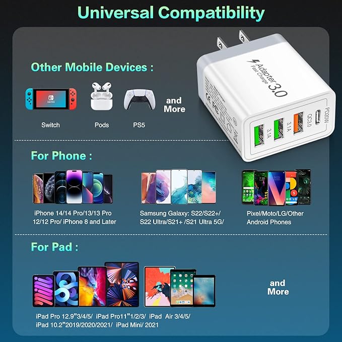 - 【35W 4-Port USB Charger】: This USB wall charger supplies an input voltage of 100-240 volts, with a total power output of up to 35W. It includes 1 USB-C PD 3.0 port, 1 Fast Charge 3.0 USB-A Port, and 2 Adaptive Fast USB-A Ports, allowing for simultaneous charging of multiple devices such as mobile phones, tablets, headphones, smartwatches, Switch, and other devices. It's highly convenient for use at home, in the office, during travel, and on the go.