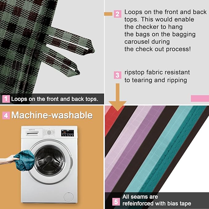 - RIP-STOP FABRIC & WATERPROOF: These grocery shopping bags are made of 100% RIP-STOP Polyester cloth which is ideal fabric for washable grocery shopping bags. It is Lightweight but VERY Sturdy and Resistant to Rips and Water. By reusing reusable grocery bags heavy duty & keeping plastic out of landfills & oceans!