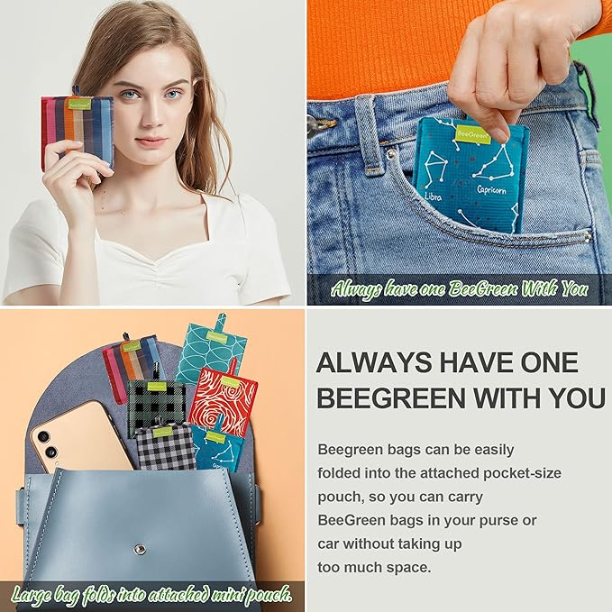 - FOLDABLE CONVENIENT & EASY TO CARRY AROUND: Our reusable grocery bags are foldable, they can be easily folded into the attached pocket-size pouch,so you can carry these grocery bags fold into your purse,backpack,pocket or the glove box of the car,which take up hardly any space.Then you will always have foldable reusable shopping bags with you ,whether you stop by a store on whim or have an unplanned shopping trip.