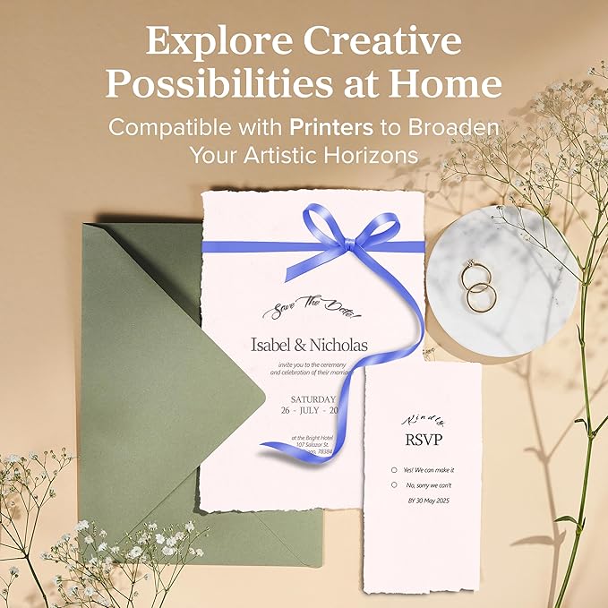 - [Home Printer Friendly]: Compatible with most home printers, this A6 size deckled edge paper allows you to create personalized invitations, menus, thank you cards, and more. For best results, feed one sheet at a time through the manual feed tray of your printer. This 150gsm paper is ideal for printing at home, whether you are printing your own designs, cards, or small batch items. 50 sheets of 10.5 x 15 cm paper are included in each pack