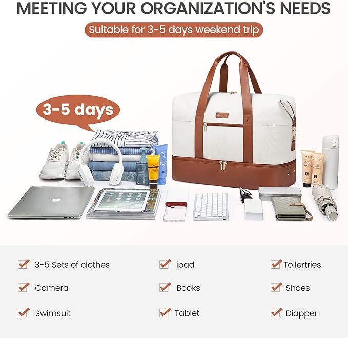 - 【LARGE CAPACITY FOR 5 DAYS TRIP】Large-capacity Weekender Bag is enough to hold the clothes needed for three to five days of trip. The interior features plenty of pockets and compartments to keep small essentials like shoes, laptop and toiletries organized.