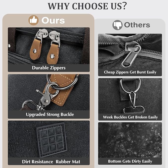 - Multipurpose: Suitable for both men and women, the Canvas Travel Duffel Bag can be used as a weekender bag, overnight bag, short-term travel bag, toiletry kit, camping bag, business bag, gym tote, carry-on luggage, or simply as an emergency bag