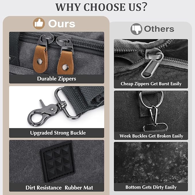 - Multipurpose: Suitable for both men and women, the Canvas Travel Duffel Bag can be used as a weekender bag, overnight bag, short-term travel bag, toiletry kit, camping bag, business bag, gym tote, carry-on luggage, or simply as an emergency bag