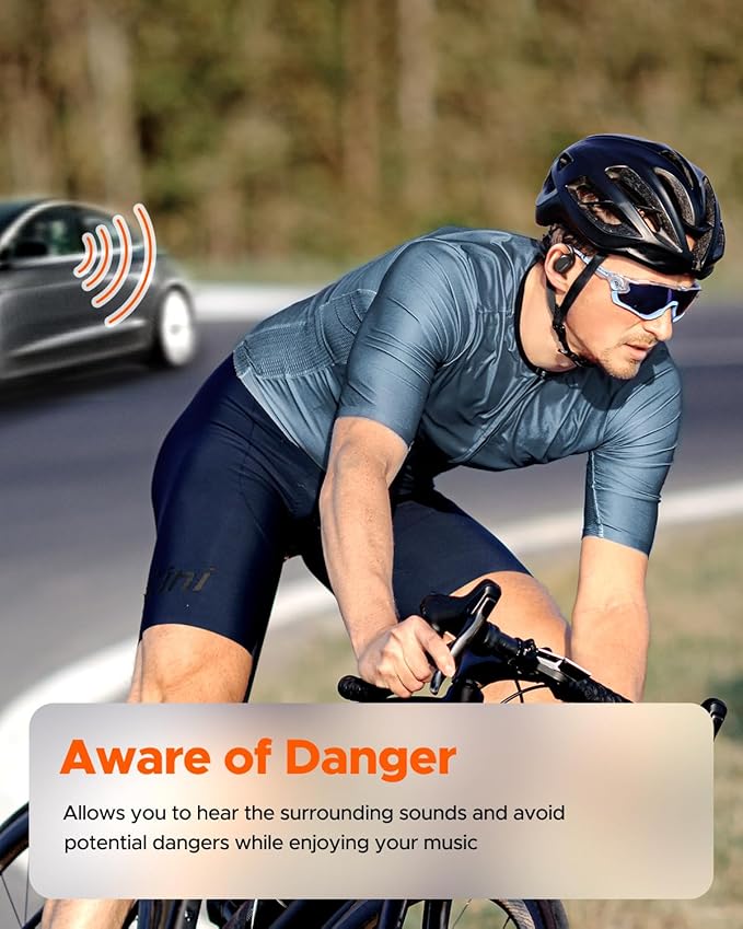 - Open-ear Comfort & Aware Of Danger: The open-ear design of bluetooth headphones helps to achieve true painlessly and harmlessly. No need to put the earbuds in the ear canal, so ears will not feel sore and painful even listening to music for the whole day. These headphones also allow you to hear the surrounding sounds and avoid potential dangers while enjoying your music, especially outdoors, walking on the street or riding a bicycle.