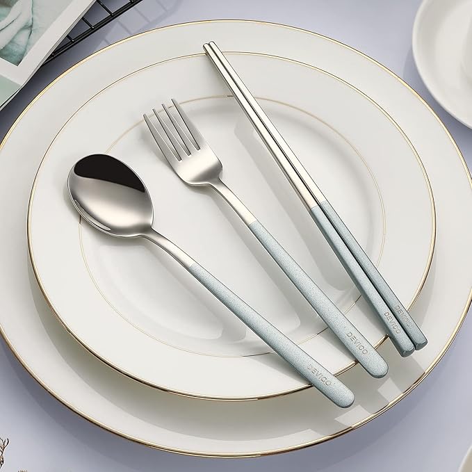 - MODERN DESIGN: The travel spoon with no sharp edges and no rough spots, bright face, fine workmanship. The travel fork polished through multiple processes, long teeth can easy to insert, but won't cut the lips. The travel chopsticks with laser anti-slip texture, easy to use