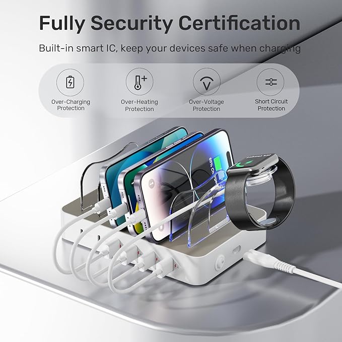 - FULL PROTECTION: The multiple device charger station intelligently identifies and distributes the current according to the needs of each device. It is equipped with over-heat, over-current, over-voltage, and short-circuit protection, ensuring complete safety for both you and your device.