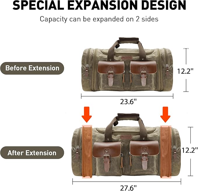 - 【Large and Expandable Capacity】You will be surprised at the size of this travel bag. Regular dimensions are (L)23.6 x (W)11 x (H)12.2 inches (50L). Extends to (L)27.6 x (W)11 x (H)12.2 inches (60L). The internal capacity is large enough to store clothes and travel essentials for 7-9 days. Can also be used as a carry-on flight bag.