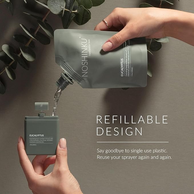 - REFILLABLE POCKET SPRAYERS: Includes 3 refillable pocket hand sanitizer sprayers in Bergamot, Eucalyptus and Lavender. Each premium soft-touch travel hand sanitizer 300+ sprays and helps reduce plastic waste with our eco-conscious refill system.