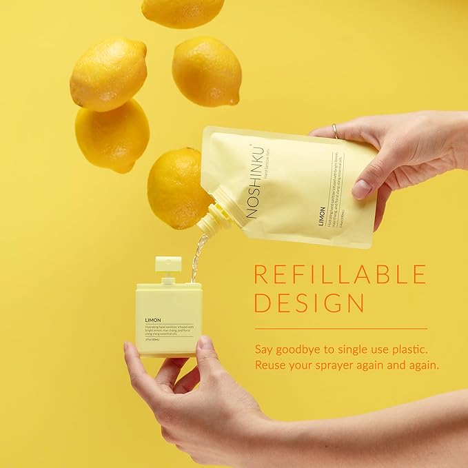 - REFILLABLE POCKET SPRAYERS: Includes 3 refillable pocket hand sanitizer sprayers in Limon, Orange Coriander and Vetiver. Each premium soft-touch travel hand sanitizer 300+ sprays and helps reduce plastic waste with our eco-conscious refill system.
