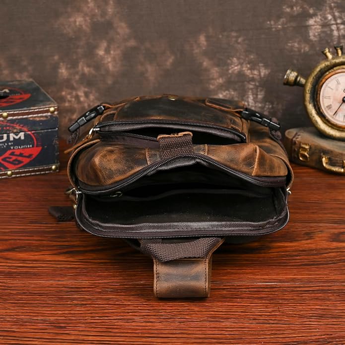 - 【Top Quality Material】This chest bag is made of top quality genuine crazy horse leather trim.The premium quality ensure the long lasting durability. crafted with a tight double-knit weave, it's strong, hard-wearing, scratch-resistant. The crazy horse leather is made of high-end top layer cowhide material, with a thickness of 2.5mm, which is solid and durable.And the quality solid hardware won’t gather rust easily.
