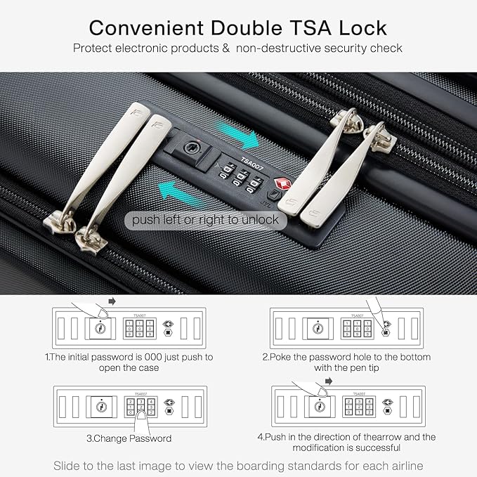 - 【Travel locks and spinner wheels】The travel approved carry on luggage can protect the security of electronic products and undergo non-destructive safety checks, making it more convenient and secure; The hard sided luggage with spinner wheels with rotating wheels that are very durable, quiet, and have strong load-bearing capacity. It can be easily operated on different roads such as cobblestone and carpet roads.
