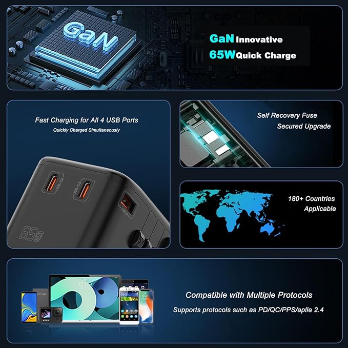 - PD 65W Fast Charging: This travel adapter innovative gallium nitride technology has been adopted to achieve 65W lightning charging, supports multiple fast charging protocols such as PD/QC/PPS/AFC/FCP/aplle 2.4/DCP.