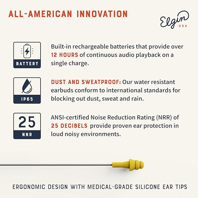 Elgin Ruckus Wireless Bluetooth Earplug Headphones, 25 dB NRR, Noise Canceling Mic, 12-Hour Battery, IP65 Sweatproof, Compliant with OSHA Hearing Safety Standards