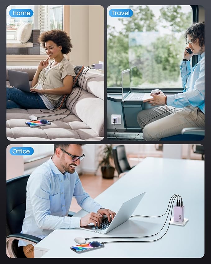 128W USB C Wall Charger,GaN III 3-Port Fast Charging Station,PD QC Foldable Charger Block Portable 65W Laptop Adapter for MacBook Pro/Air,iPad Pro,Galaxy S23,Dell XPS 13,iPhone 16/15/Pro etc