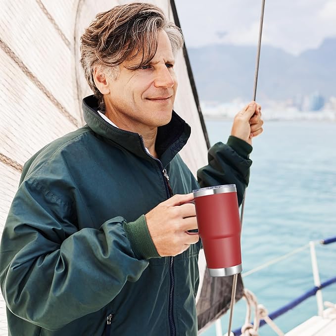 - High Quality And Easy To Hold: The 20 oz travel coffee mug is made of thickened 304 18/8 stainless steel. Electro polished inside make you every sip of water pure and sweet. Matte powder coating outside is sweatproof. Equipped with a sturdy 360°welded handle let you easy to hold the coffee travel tumbler