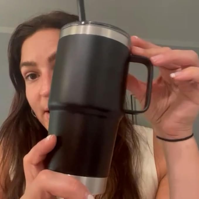 - High Quality And Easy To Hold: The 20 oz travel coffee mug is made of thickened 304 18/8 stainless steel. Electro polished inside make you every sip of water pure and sweet. Matte powder coating outside is sweatproof. Equipped with a sturdy 360°welded handle let you easy to hold the coffee travel tumbler