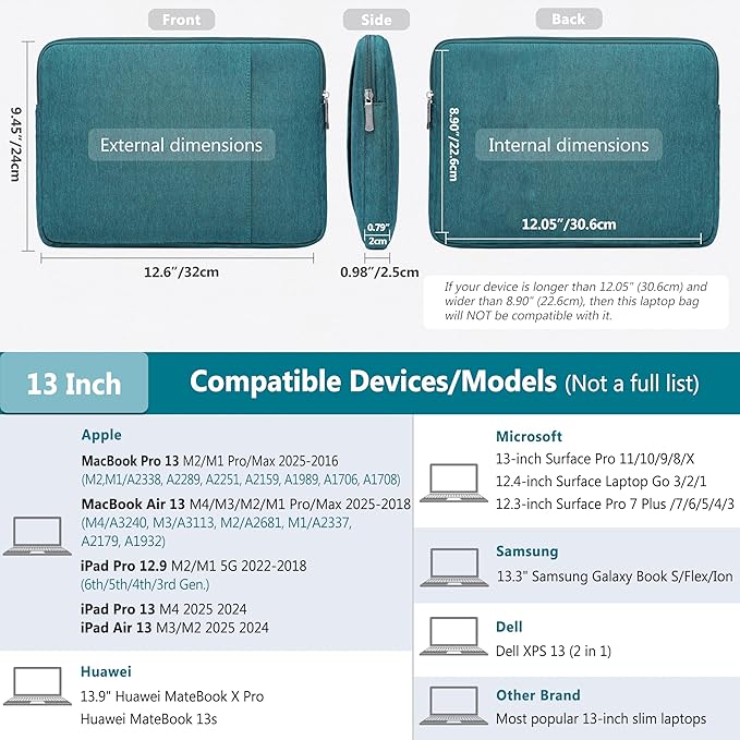 - Internal Dimensions: 12.05" x 8.9" x 0.79". Compatible with MacBook Air 13 M4/M3/M2/M1 2025-2018 (A3240, A3113, A2681, A2337, A2179, A1932), MacBook Pro 13 M2/M1 Pro/Max 2025-2016 (A2338, A2289, A2251, A2159, A1989, A1706, A1708), Dell XPS 13, 13"-12.3" Surface Pro, 12.4" Surface Laptop Go, iPad Pro 13 M4, iPad Air 13 M3/M2, iPad Pro 12.9 2022-2018, Huawei MateBook 13s, 13.9" Huawei MateBook X Pro, 13.3" Samsung Galaxy Book S/Flex/Ion, and most 12"-13" slim laptops/tablets, etc.