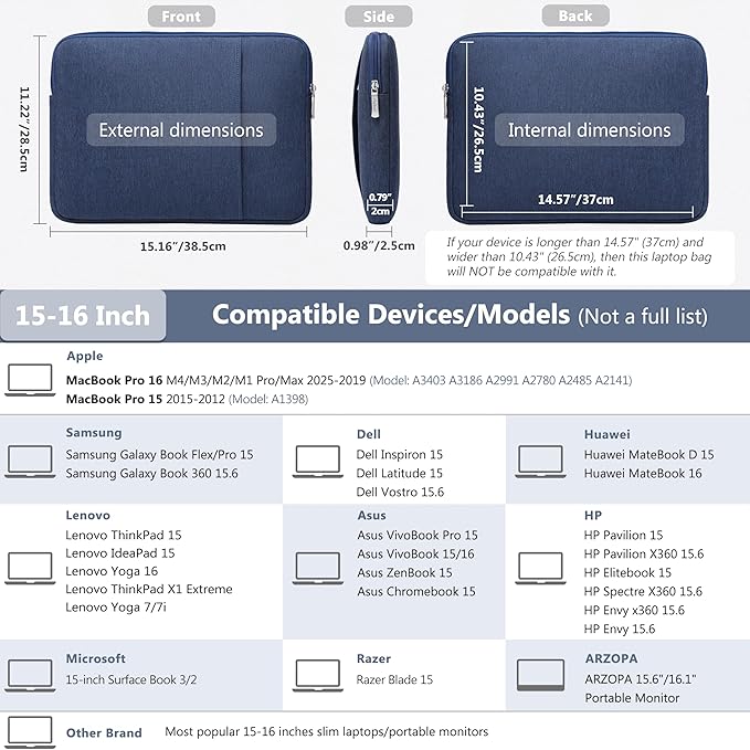 - Internal Dimensions: 14.57" x 10.43" x 0.79". Compatible with MacBook Pro 16 M4/M3/M2/M1 Pro/Max 2025-2019 (A3186 A3403 A2991 A2780 A2485 A2141), MacBook Pro 15 2015-2012 (A1398), HP Pavilion/Elitebook/Envy 15, HP Pavilion/Spectre/Envy X360 15.6, 15" Surface Book, Dell XPS 16, Dell Inspiron/Latitude/Precision/Vostro 15, Samsung Galaxy Book Flex/Pro 15, Asus ZenBook/VivoBook Pro 15, Lenovo IdeaPad/ThinkPad 15, Yoga/ThinkBook 16, VivoBook 15/16, ARZOPA 15.6"/16.1" Portable Monitor, etc.