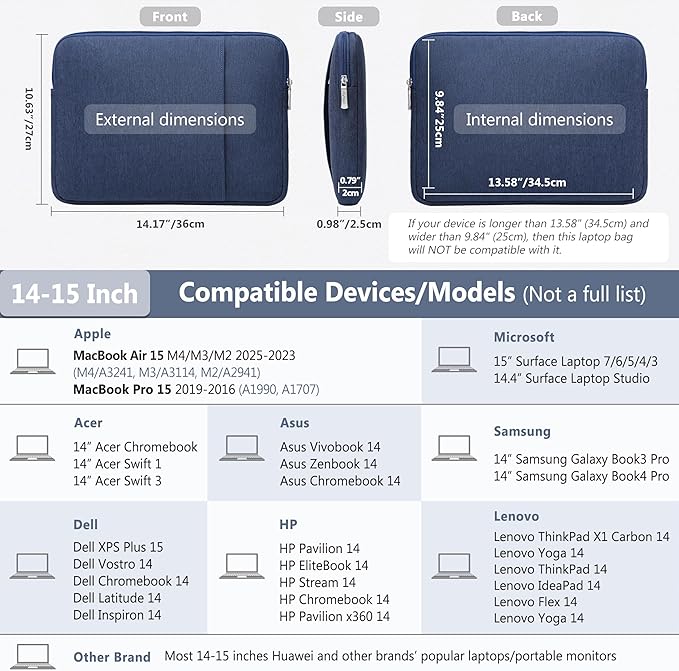 - Internal Dimensions: 13.58" x 9.84" x 0.79". Compatible with MacBook Air 15 M4/M3/M2 2025-2023(A3241, A3114, A2941), MacBook Pro 15 2019-2016(A1990, A1707), 14.4" Surface Laptop Studio, 15" Surface Laptop, HP Pavilion/EliteBook/Stream/Chromebook/Pavilion X360 14, Dell XPS 14/15 Plus, Dell Vostro/Chromebook/Latitude/Inspiron 14, Asus Vivobook/Zenbook/Chromebook 14, 14" Acer Chromebook/Swift 1/3, ThinkPad/IdeaPad/Flex/Yoga 14, ThinkPad X1 Carbon/Yoga 14, 14" Samsung Galaxy Book3/Book4 Pro, etc.