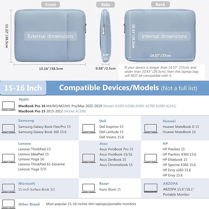 - Internal Dimensions: 14.57" x 10.43" x 0.79". Compatible with MacBook Pro 16 M4/M3/M2/M1 Pro/Max 2025-2019 (A3186 A3403 A2991 A2780 A2485 A2141), MacBook Pro 15 2015-2012 (A1398), HP Pavilion/Elitebook/Envy 15, HP Pavilion/Spectre/Envy X360 15.6, 15" Surface Book, Dell XPS 16, Dell Inspiron/Latitude/Precision/Vostro 15, Samsung Galaxy Book Flex/Pro 15, Asus ZenBook/VivoBook Pro 15, Lenovo IdeaPad/ThinkPad 15, Yoga/ThinkBook 16, VivoBook 15/16, ARZOPA 15.6"/16.1" Portable Monitor, etc.