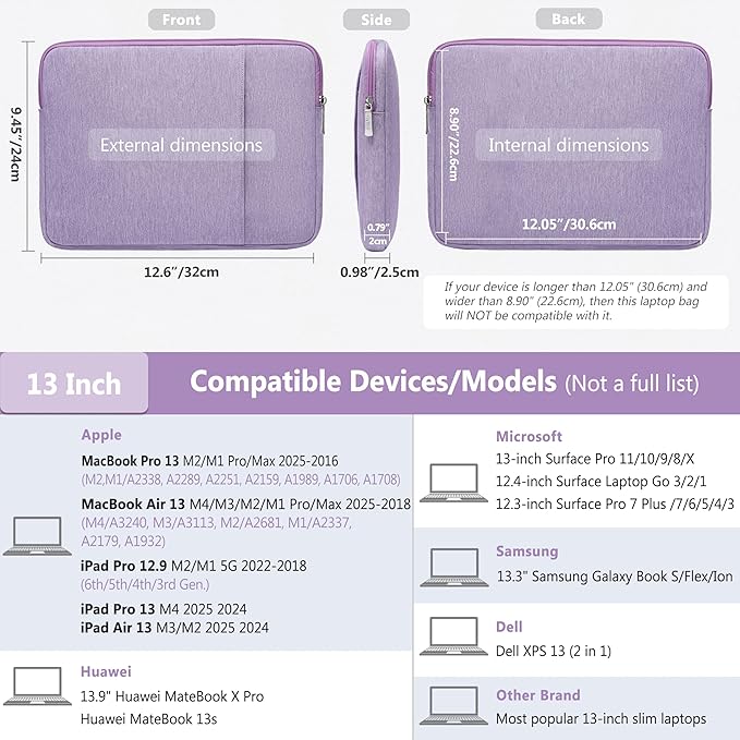 - Internal Dimensions: 12.05" x 8.9" x 0.79". Compatible with MacBook Air 13 M4/M3/M2/M1 2025-2018 (A3240, A3113, A2681, A2337, A2179, A1932), MacBook Pro 13 M2/M1 Pro/Max 2025-2016 (A2338, A2289, A2251, A2159, A1989, A1706, A1708), Dell XPS 13, 13"-12.3" Surface Pro, 12.4" Surface Laptop Go, iPad Pro 13 M4, iPad Air 13 M3/M2, iPad Pro 12.9 2022-2018, Huawei MateBook 13s, 13.9" Huawei MateBook X Pro, 13.3" Samsung Galaxy Book S/Flex/Ion, and most 12"-13" slim laptops/tablets, etc.