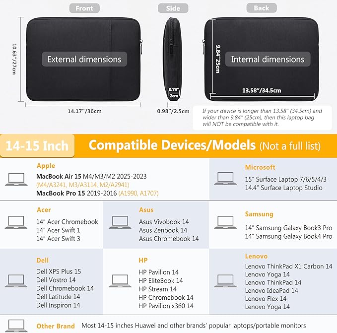 - Internal Dimensions: 13.58" x 9.84" x 0.79". Compatible with MacBook Air 15 M4/M3/M2 2025-2023(A3241, A3114, A2941), MacBook Pro 15 2019-2016(A1990, A1707), 14.4" Surface Laptop Studio, 15" Surface Laptop, HP Pavilion/EliteBook/Stream/Chromebook/Pavilion X360 14, Dell XPS 14/15 Plus, Dell Vostro/Chromebook/Latitude/Inspiron 14, Asus Vivobook/Zenbook/Chromebook 14, 14" Acer Chromebook/Swift 1/3, ThinkPad/IdeaPad/Flex/Yoga 14, ThinkPad X1 Carbon/Yoga 14, 14" Samsung Galaxy Book3/Book4 Pro, etc.