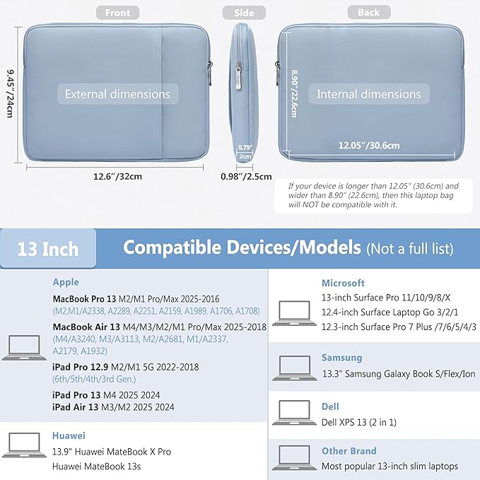 - Internal Dimensions: 12.05" x 8.9" x 0.79". Compatible with MacBook Air 13 M4/M3/M2/M1 2025-2018 (A3240, A3113, A2681, A2337, A2179, A1932), MacBook Pro 13 M2/M1 Pro/Max 2025-2016 (A2338, A2289, A2251, A2159, A1989, A1706, A1708), Dell XPS 13, 13"-12.3" Surface Pro, 12.4" Surface Laptop Go, iPad Pro 13 M4, iPad Air 13 M3/M2, iPad Pro 12.9 2022-2018, Huawei MateBook 13s, 13.9" Huawei MateBook X Pro, 13.3" Samsung Galaxy Book S/Flex/Ion, and most 12"-13" slim laptops/tablets, etc.