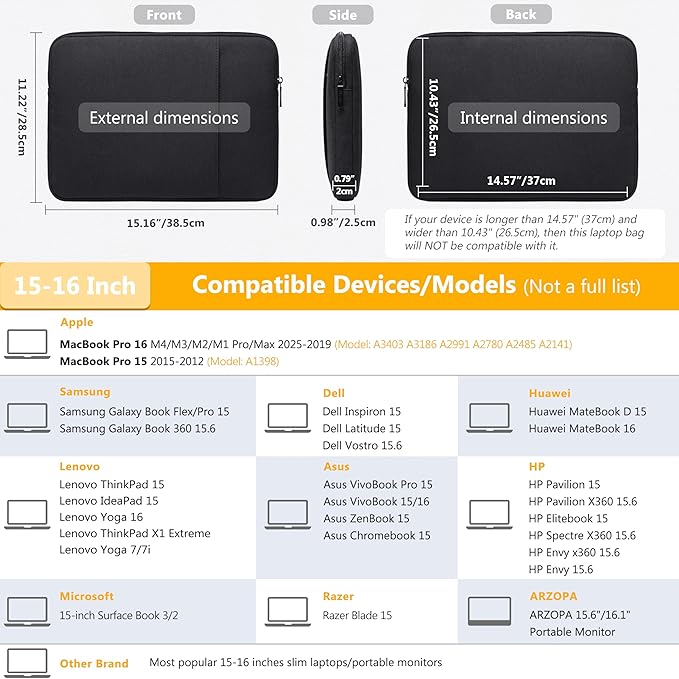 - Internal Dimensions: 14.57" x 10.43" x 0.79". Compatible with MacBook Pro 16 M4/M3/M2/M1 Pro/Max 2025-2019 (A3186 A3403 A2991 A2780 A2485 A2141), MacBook Pro 15 2015-2012 (A1398), HP Pavilion/Elitebook/Envy 15, HP Pavilion/Spectre/Envy X360 15.6, 15" Surface Book, Dell XPS 16, Dell Inspiron/Latitude/Precision/Vostro 15, Samsung Galaxy Book Flex/Pro 15, Asus ZenBook/VivoBook Pro 15, Lenovo IdeaPad/ThinkPad 15, Yoga/ThinkBook 16, VivoBook 15/16, ARZOPA 15.6"/16.1" Portable Monitor, etc.