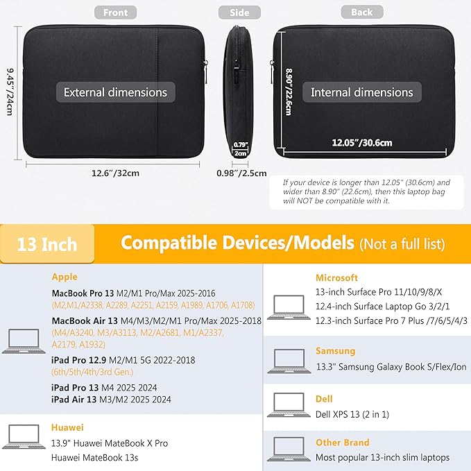 - Internal Dimensions: 12.05" x 8.9" x 0.79". Compatible with MacBook Air 13 M4/M3/M2/M1 2025-2018 (A3240, A3113, A2681, A2337, A2179, A1932), MacBook Pro 13 M2/M1 Pro/Max 2025-2016 (A2338, A2289, A2251, A2159, A1989, A1706, A1708), Dell XPS 13, 13"-12.3" Surface Pro, 12.4" Surface Laptop Go, iPad Pro 13 M4, iPad Air 13 M3/M2, iPad Pro 12.9 2022-2018, Huawei MateBook 13s, 13.9" Huawei MateBook X Pro, 13.3" Samsung Galaxy Book S/Flex/Ion, and most 12"-13" slim laptops/tablets, etc.
