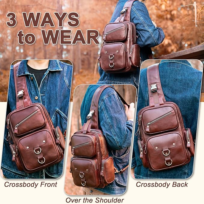 - GENUINE LEATHER SLING CHEST BAG – This high capacity sling chest bag for men have an elegant genuine leather exterior and a contrasting heavy duty cotton inner lining. Highly adaptable, this leather bag is suitable for hiking, cycling, and daily travel