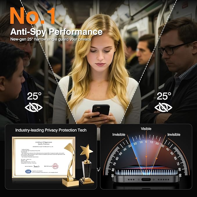 - [Excellent Privacy Protection]: EZ-GLAZ iPhone 14 privacy screen protector achieves 25° ultra-strong privacy function. Block people's sight trying to see your secrets from both sides when you are in an elevator, subway, bank or other public places.