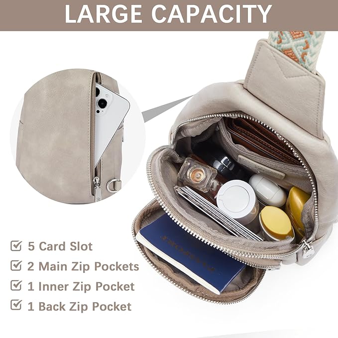 - Large Capacity, Stay Organized - This leather sling bag has 4 Zip pockets. The well-organized space accommodates your wallet, phone, sunscreen, cosmetics, keys, cards, and other necessary items. The five card slots provide convenient storage for your ID cards, credit cards, and transit cards, making them easily accessible