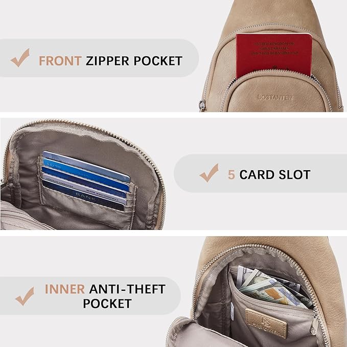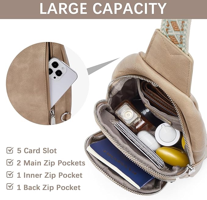 - Large Capacity, Stay Organized - This leather sling bag has 4 Zip pockets. The well-organized space accommodates your wallet, phone, sunscreen, cosmetics, keys, cards, and other necessary items. The five card slots provide convenient storage for your ID cards, credit cards, and transit cards, making them easily accessible