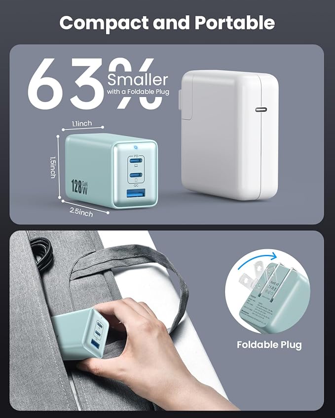 128W USB C Wall Charger,GaN III 3-Port Fast Charging Station,PD QC Foldable Charger Block Portable 65W Laptop Adapter for MacBook Pro/Air,iPad Pro,Galaxy S23,Dell XPS 13,iPhone 16/15/Pro etc