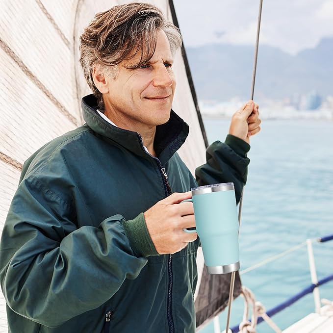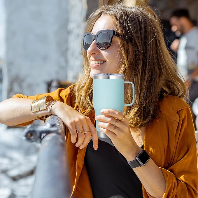 - High Quality And Easy To Hold: The 20 oz travel coffee mug is made of thickened 304 18/8 stainless steel. Electro polished inside make you every sip of water pure and sweet. Matte powder coating outside is sweatproof. Equipped with a sturdy 360°welded handle let you easy to hold the coffee travel tumbler