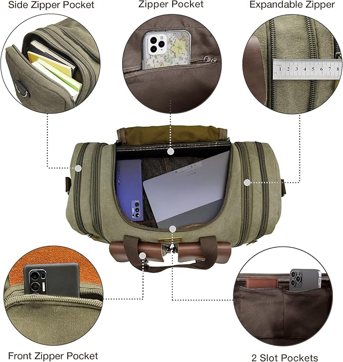 Wildroad 60L Travel Duffel Bag, Expandable Canvas Genuine Leather Duffle Bag Upgraded Overnight Weekender Bag Carry on Bag
