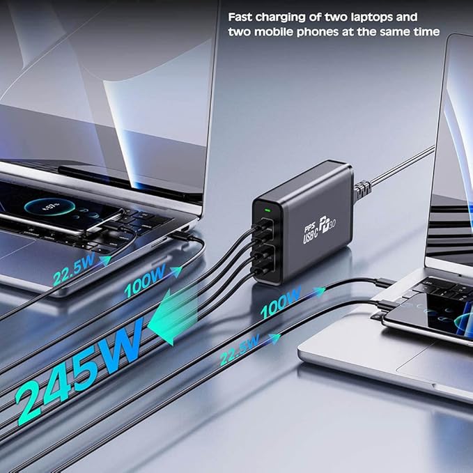 - 【245W Desktop GaN Charger】This is a 4-port USB charger with fewer ports and more wattage, the charging station has a maximum power of 245W, which can charge 4 devices at the same time, there are 2 Type-C ports and 2 USB-A ports, the single port USB C1/USB C2 can output up to 100W of power, and when all four ports are used at the same time the power is as follows: 100W+100W+22.5W+22.5 W (Max 245W). Ultra-fast charging for phones, watches and headphones