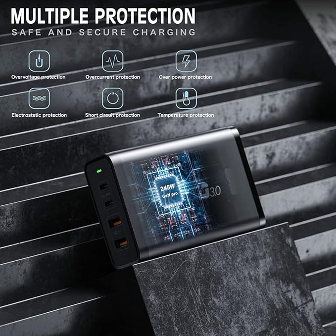 - Special Feature : 245W high power, 4-ports, 2USB C + 2USB A, GaN pro technology, Independent fast charging, With grounded power cord 245W high power, 4-ports, 2USB C + 2USB A, GaN pro technology, Independent fast charging, With grounded power cord