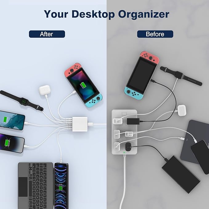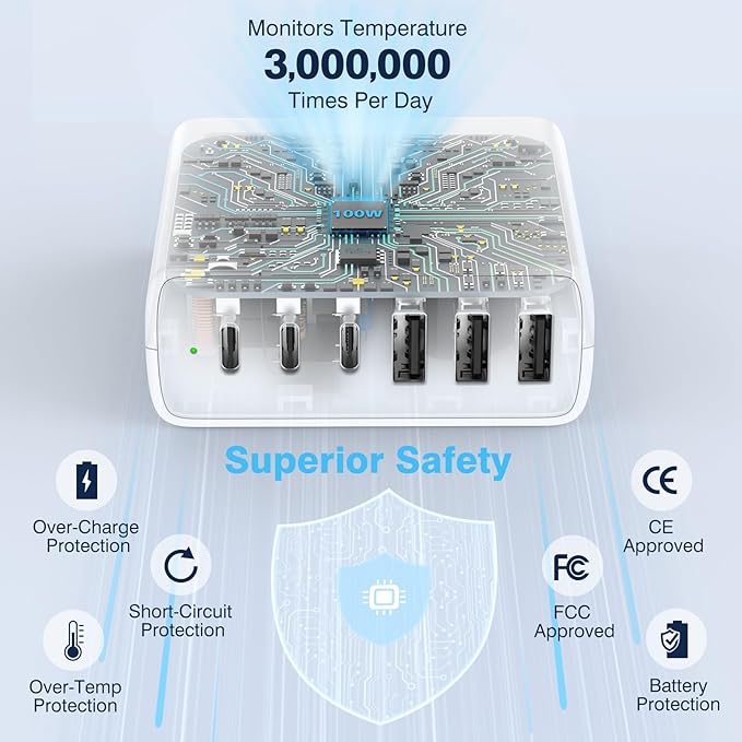 - 6 in 1 100W Desktop Charging Station: Equipped with 3 USB-C ports and 3 USB-A ports: USB C1: PPS 25W, USB C2: PD 20W, USB C3: PD 20W, USB A1: QC 18W, USB A2/A3 share 12W, and max 12W while single port charging. Fast charging six of your devices simultaneously instead of taking up 6 wall outlets. 5FT Extended power cord is convenient for home or office