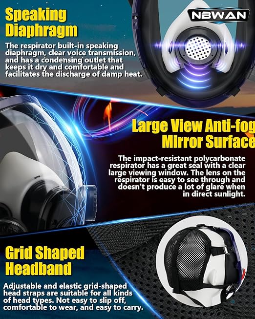 - 【Speaking Diaphragm & Adjust Headband】- The respirator mask with filters has an airflow valve that helps to act as a speaking diaphragm so that your voice is not completely muffled and communicate clearly. The chemical respirator with 5 points headband and the mesh structure makes wearing more stable. The full face respirator adjustable high elastic strap is suitable for most head sizes.