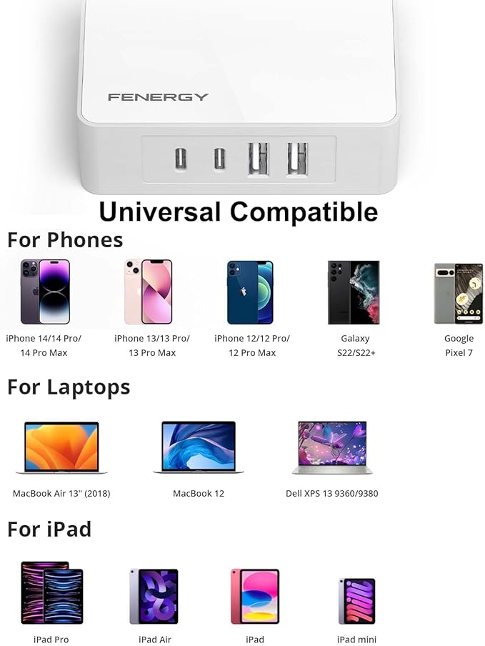 Fenergy 65W USB C Charger Block, GaN Fast Charging Station Hub, 4-Ports USB C and USB A Multiport Desktop Charger Adapter Plug Cube with 6ft AC Cable for iPhone 15 Pro Max/iPad/Galaxy/Tablet and More