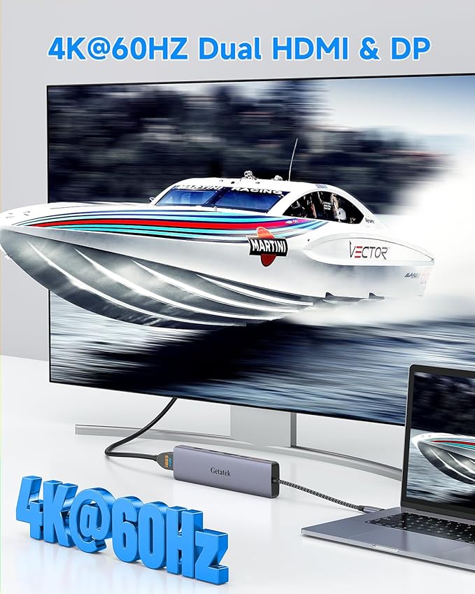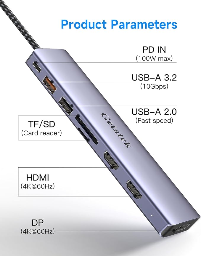 - 8 in 1 Laptop Docking Station - Plug and play. With this usb c multiple adapter, you will get 2*4K@60HZ Ultra HD HDMI, 1*4K@60HZ Ultra HD display port,100W PD charging port, 1 USB A 3.2(10Gbps), 1*USB A 2.0, SD/TF card reader.