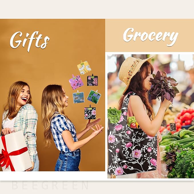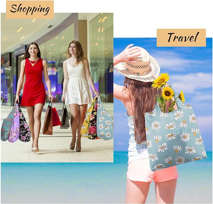 - UNIQUE DESIGN WITH PRINTS BAGS: Foldable reusable grocery bags available in 6 different Flower patterns,suitable for both men and women. The patterns of resuable shopping bags are designed exclusively. This retro and simple animal style makes our shopping bag a perfect gift for women .Our shopping bags can be used for daily shopping or storage, or seaside holidays, travel, camping etc.