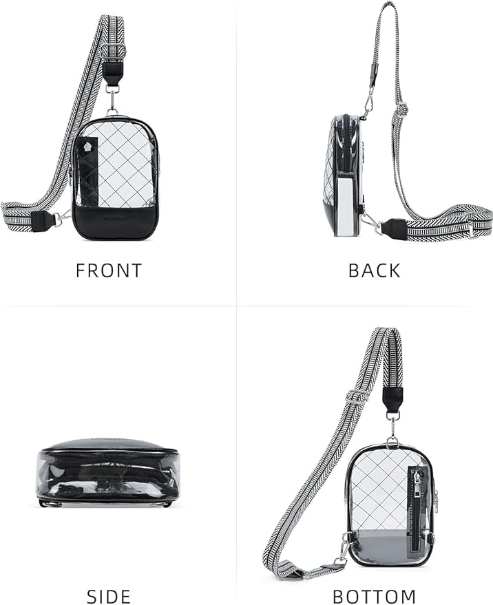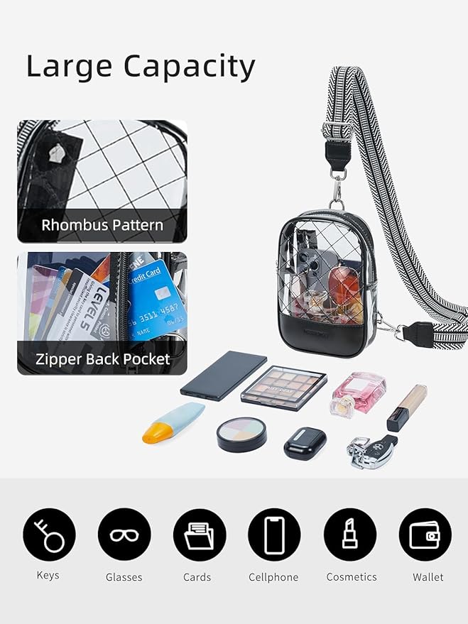 - 🎇Spacious & Organized - Featuring a spacious main pocket and a rear zipper pocket, this stadium approved clear crossbody sling bag can hold all your essentials, including phones, glasses, wallets, passports, and more. Smooth zippers ensure easy access to your items.