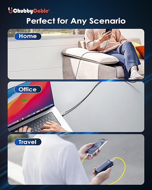 - 240W SUPER-FAST CHARGING & DATA TRANSFER: ChubbyCable USB-C to USB-C cable supports up to 240W ultra-fast charging and stable data transfer. NOTE: Fast charging is a complete solution that requires coordination between the built-in power management chip, charging cable, charger, and the device's internal system. USB-A to Type-C: 60-120W, Type-C to Type-C: 240W. With USB 2.0 transmission speeds (480 Mbps), it ensures reliable syncing and supports CarPlay for seamless in-car connectivity