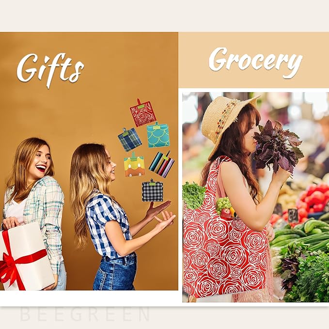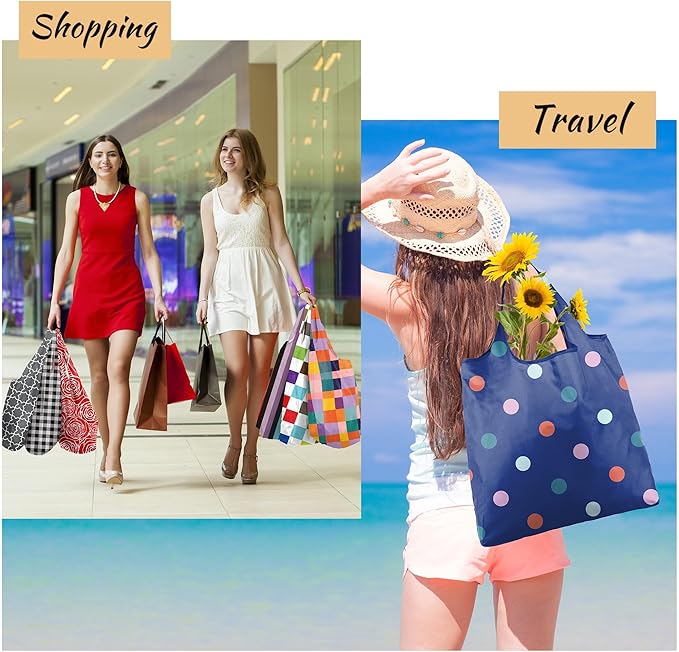 - RIPSTOP FABRIC: These reusable groceries bags are made of 100% RIP-STOP polyester cloth which is ideal fabric for washable holiday bags. It is Lightweight but VERY Sturdy and Resistant to Rips and Water. These large reusable tote bags have cute pattern design. Perfect as party favors gifts for women and girls! And can add some fun to your shopping grocery by using large reusable shopping tote bags like these.