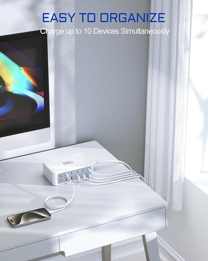 10-Ports USB and USB C Charging Station, 120W USB C Power Strip with PD3.0 and QC3.0 Fast Charging, Multiport Charging Hub for iPhone 15/14/13/12, iPad Air/Pro, Galaxy -White