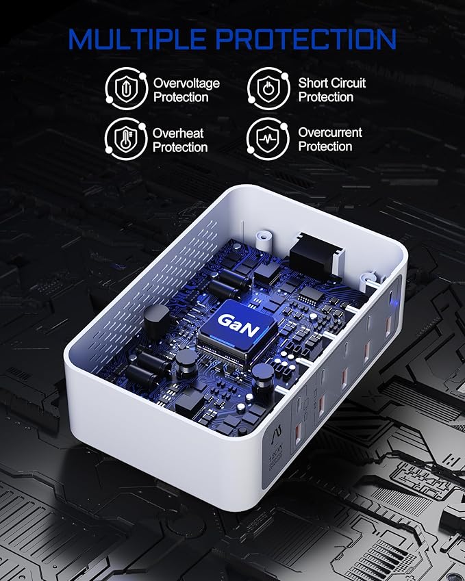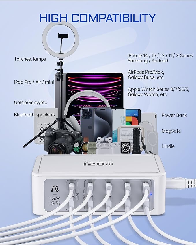 - Max 120W 10 Port: Features 5-USB C and 5-USB A(Including 1x 20W PD USB C port, 1x 18W Quick Charge 3.0 port, 4 x 10.5W USB-C port and 4 x 6.5W USB-A port. Equipped with smart charging technology that can maximize charging speed and energy efficiency for each port and provide the optimal current and the quickest charge.