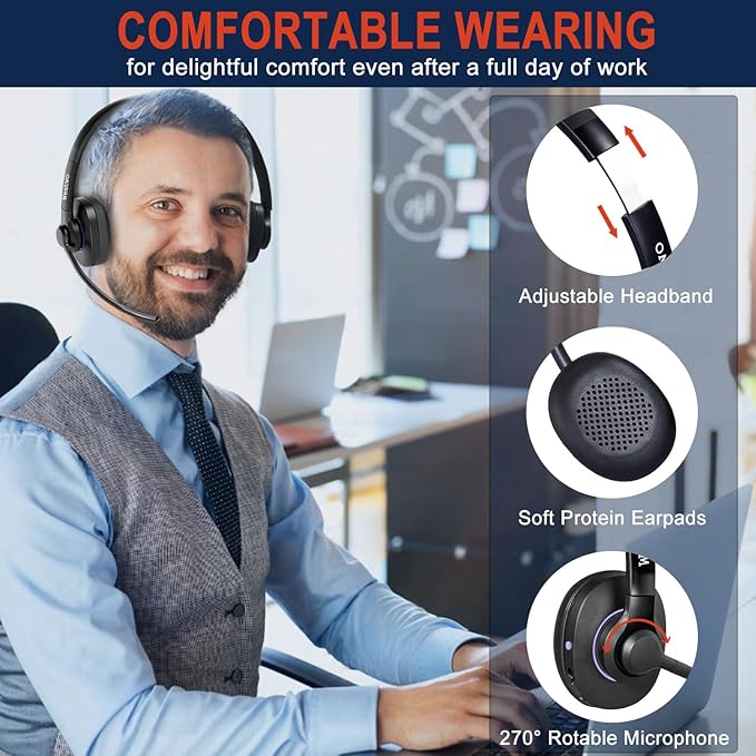 - 【2-Year Warranty & Easy Control】45 days money back & 2 years warranty. Easily adjust the volume, answer calls, switch songs, activate mute and voice applications. Plus, the Bluetooth headset can be muted by raising the microphone boom. Perfect for MS Teams, Zoom, Skype, etc.