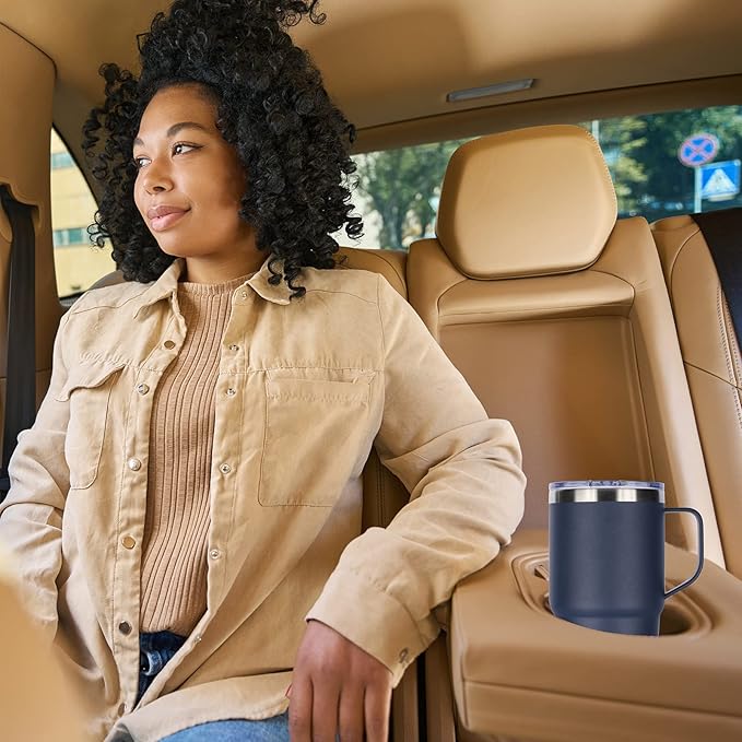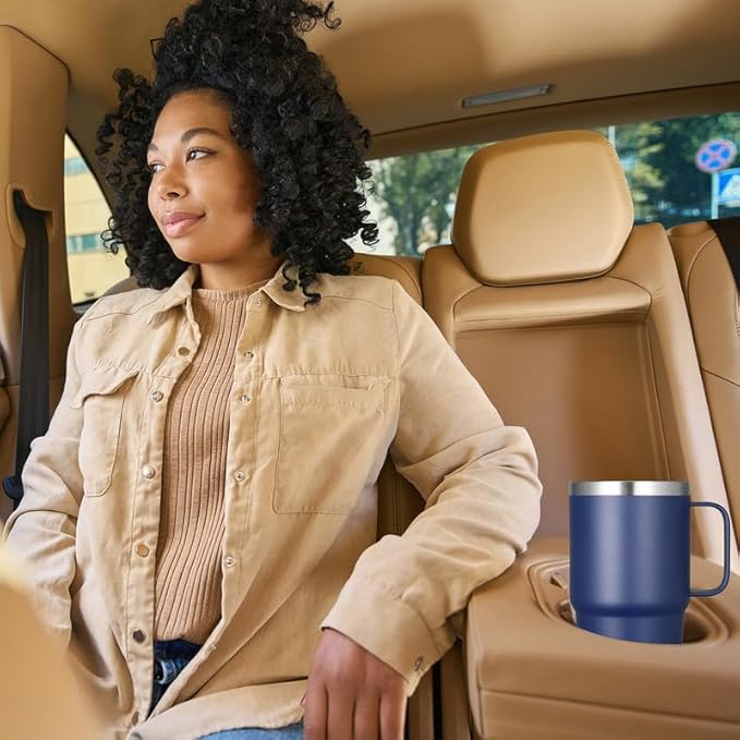- Cupholder Friendly: The travel coffee tumbler 20oz is designed with a tapered shape which fits most car cup holders, equipped with a sturdy handle that allows easy carrying. Diameter 3.38" large cup mouth makes it easier for you to clean the stainless steel mug.